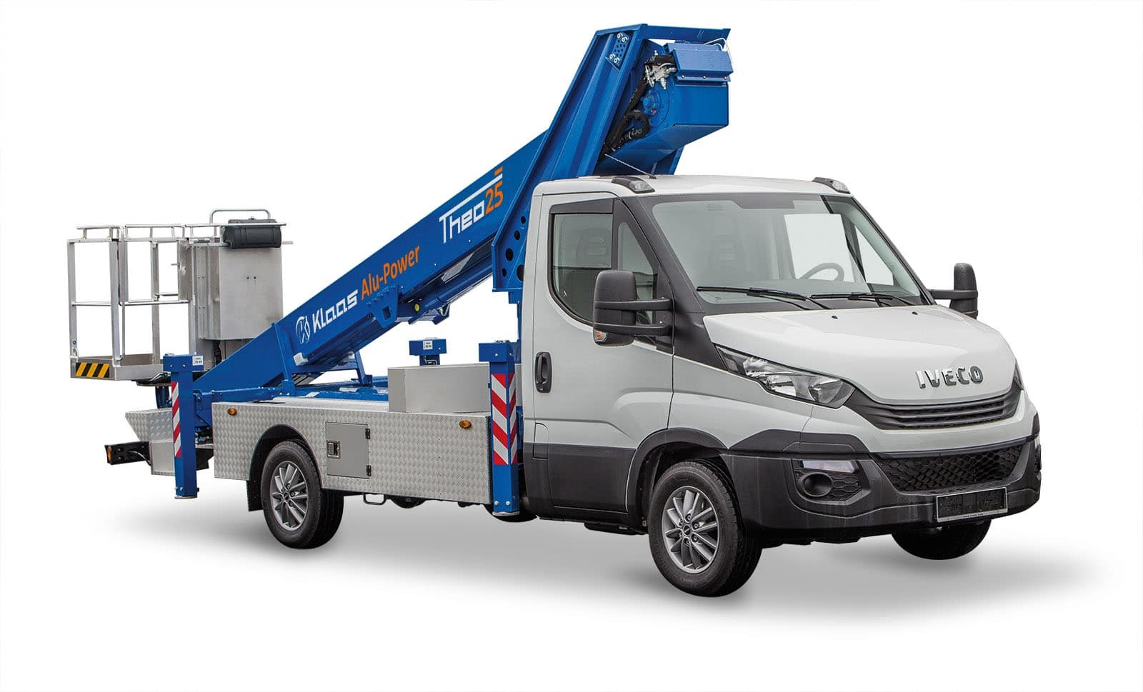Le Theo25 avec sa hauteur de travail de 25 m et son énorme portée à l'arrière et sur le côté, facilite le travail des couvreurs, des nettoyeurs de bâtiments et des entreprises de montage.